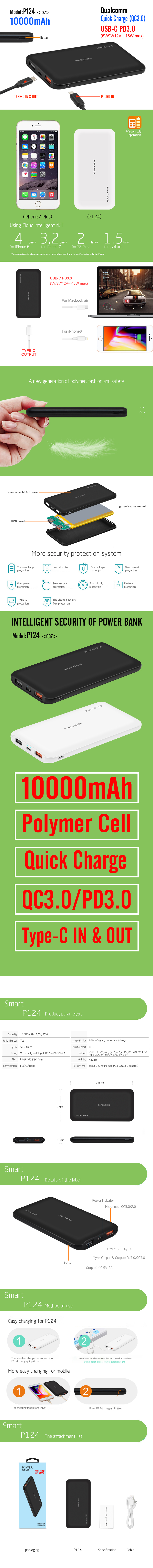 Model# P124, 10,000mAh, PD3.0 18W PB for macbook air. 18W USB-C Power Delivery Power Bank